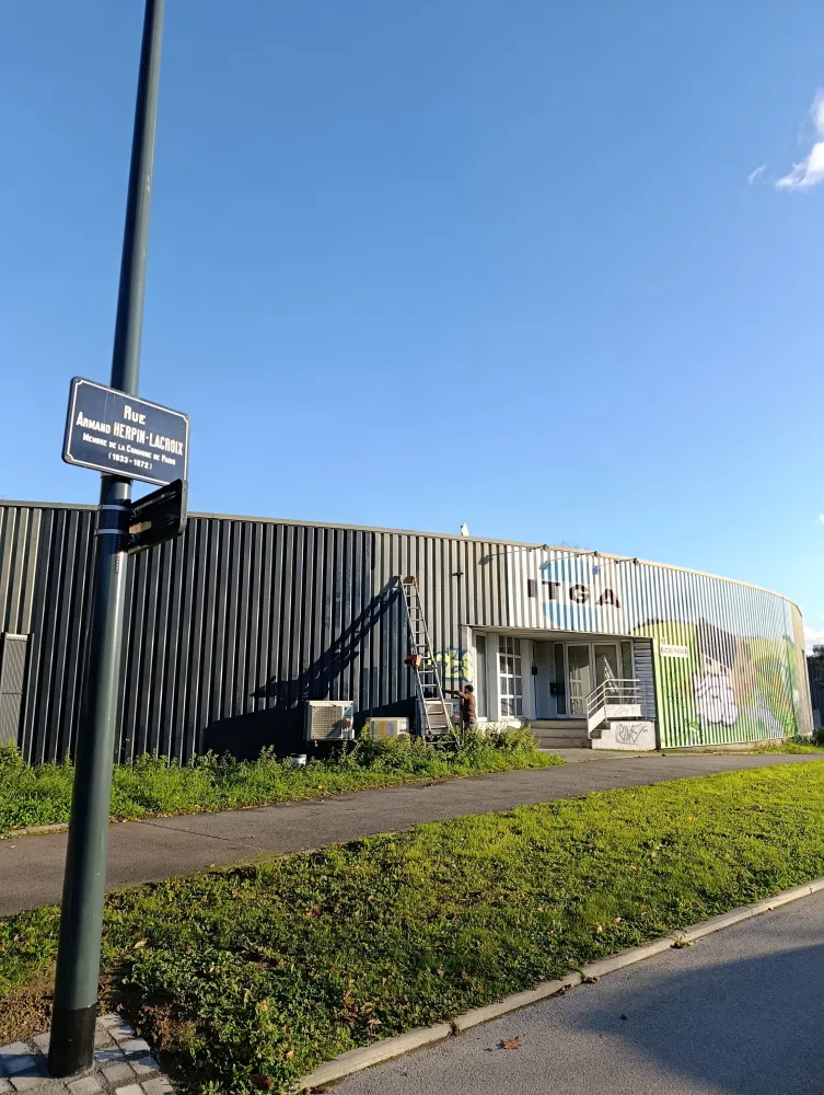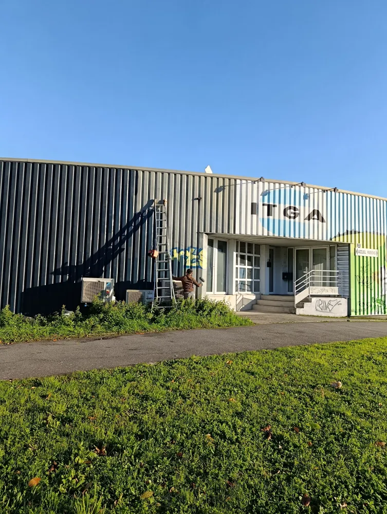 25-11-2025 Bonjour aujourd'hui nous sommes à Rennes cleunay pour une remise en peinture de tôle bardage à cause de graffiti nous avons remis en peinture gris 716